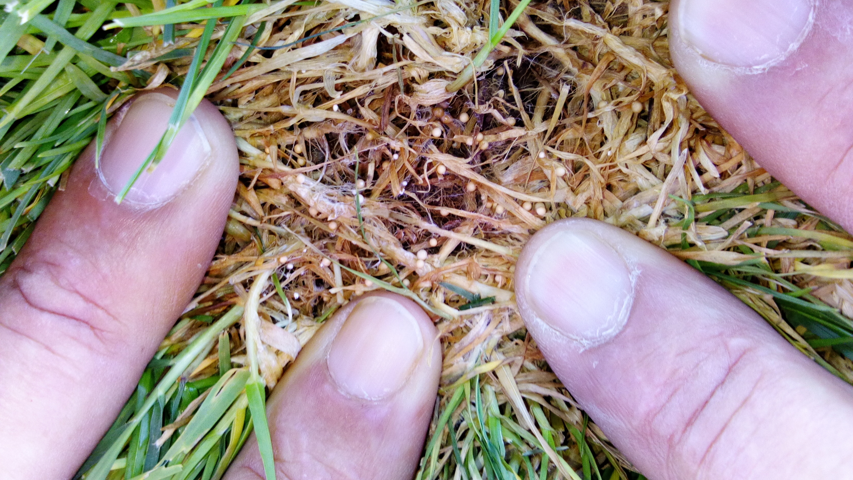 Nous avons eu cette année un démarrage progressif sur notre terrain de rugby honneur. De petits patchs caractéristiques couverts de sclérotes sont apparus. Les sclérotes sont de couleur blanche au départ et deviennent beige à marron. La gestion se fait sans fongicide de synthèse. S. rolfsii est véhiculé par les engins d’entretiens et par les crampons des joueurs. Les attaques démarrent souvent aux entrées des engins et joueurs. Il faut s’adapter au climat changeant, les attaques étant très liées aux coups de chaud. Il faut garantir une observation et une réaction rapide. En associant l’efficacité du produit et une bonne réactivité, nous sommes dans une démarche de biocontrôle confiante.