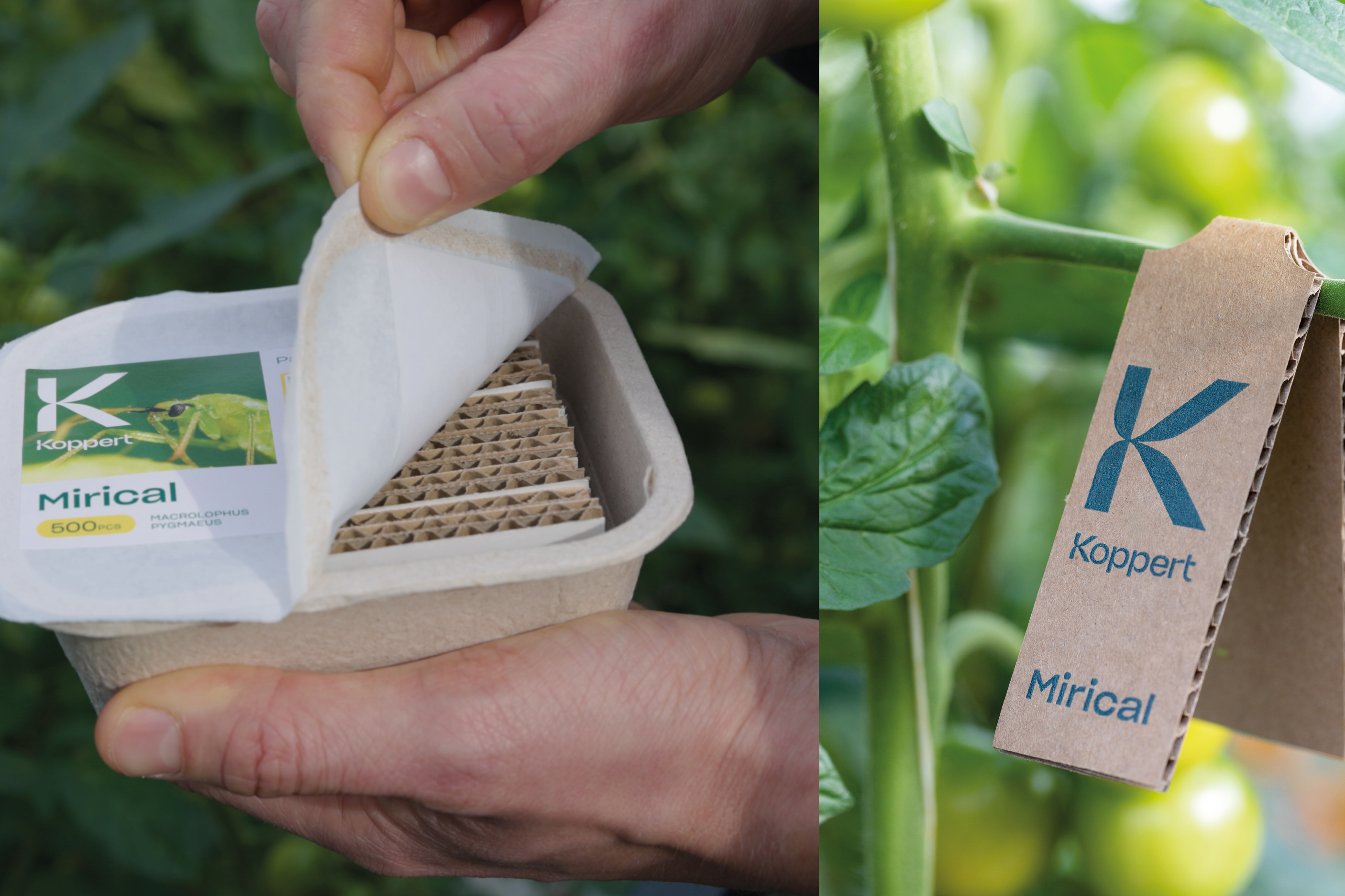 Chaque conditionnement de Mirical se compose de dix bandelettes cartonnées dans lesquelles se trouvent les punaises prédatrices. Une fois que la pellicule de protection a été soigneusement retirée de la barquette, les bandelettes peuvent être facilement réparties dans les plantes. Les bandelettes comme la barquette sont compostables, ce qui fait de Mirical un produit totalement durable.