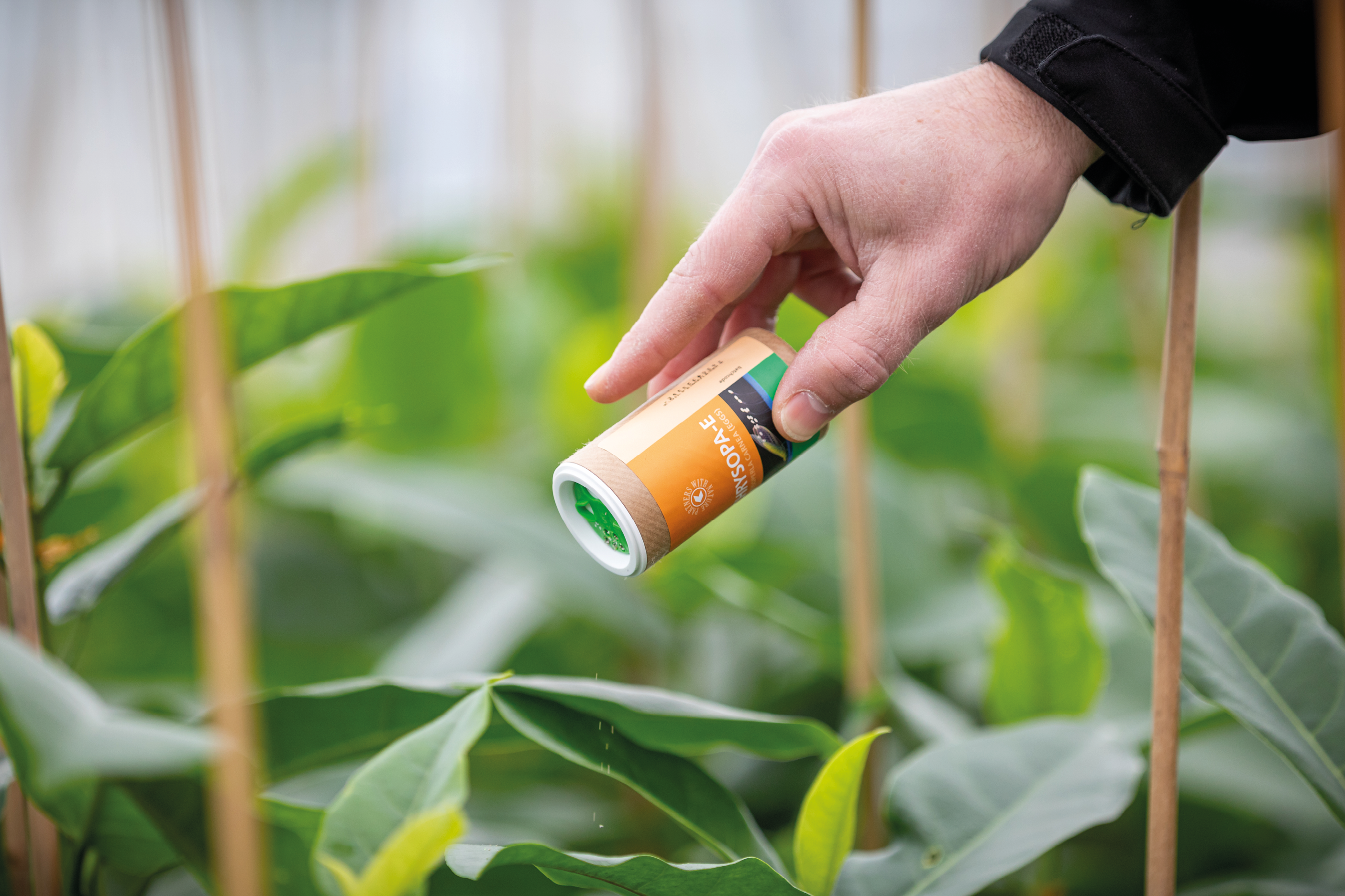 L’application est facilitée car il est non seulement possible de lâcher les oeufs de chrysope par saupoudrage au-dessus de la culture mais aussi par pulvérisation avec un pulvérisateur à dos ou un atomiseur en mélange avec l’agent liant exclusif Koppert. Cela permet ainsi un gain de temps et accroit l’homogénéité de la répartition sur la culture. De plus, Chrysopa-e ne contient pas de support, les feuilles restent donc propres ce qui est avantageux pour certaines cultures ornementales.