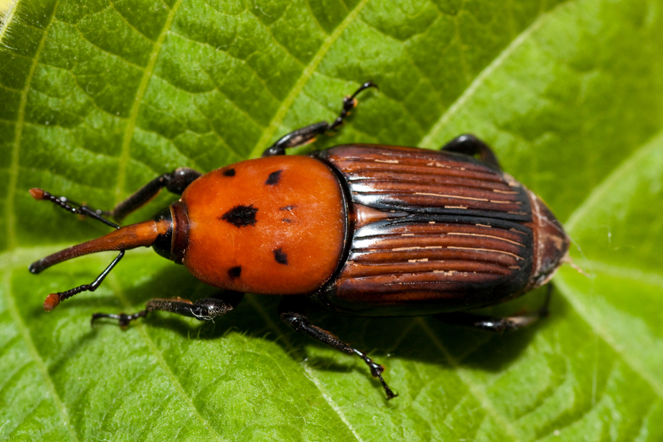 Insecte coléoptère qui détruit les palmiers en les rongeant de l'intérieur, le charançon rouge du palmier Rhynchophorus ferrugineus. cause un effondrement des palmes et dans certains cas critiques peut causer un effondrement du houpier (sommet) des palmiers. Le charançon est aujourd'hui largement disséminé dans les régions PACA, Occitanie et la Corse. Et maintenant il arrive dans le SUD-OUEST et NORD-OUEST de la France on l’on retrouve de plus en plus de palmiers dans les maisons, jardins et parcs.