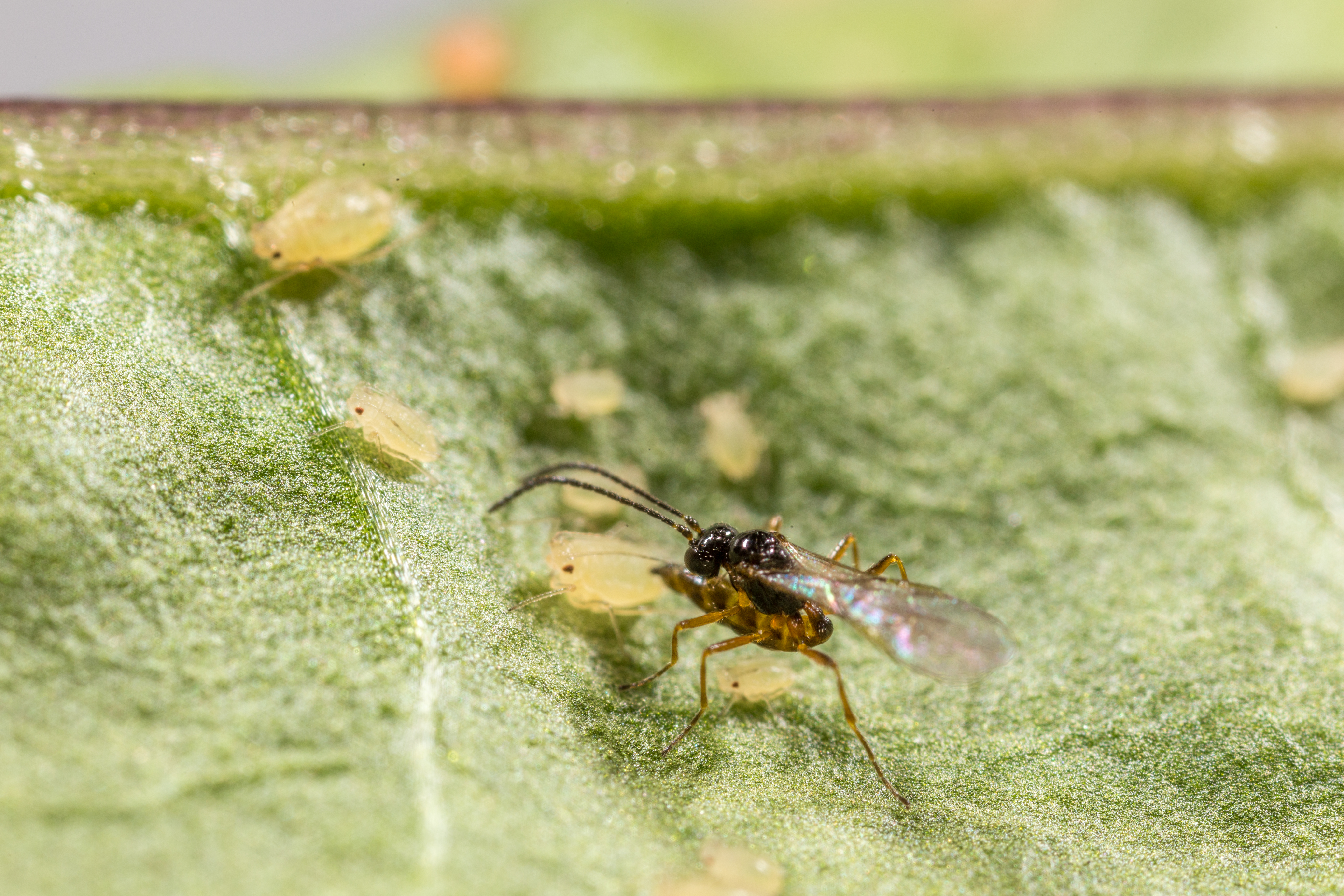 Les hyménoptères parasitoïdes sont introduits en prévention dans la culture. Les adultes pondent dans les pucerons, permettant de développer une nouvelle génération de parasitoïdes qui régulera la population de ravageurs à moyen terme.
