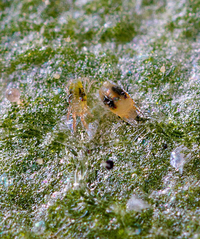 Tetranychus urticae (acarien ravageur) est l'espèce la plus répandue dans les cultures en plein champ et sous serre. Ces ravageurs percent les cellules des plantes, provoquant des stippings, un jaunissement des feuilles et finalement une nécrose. Les épidémies peuvent s'aggraver rapidement dans des conditions chaudes et sèches, ce qui nécessite des stratégies proactives et efficaces.