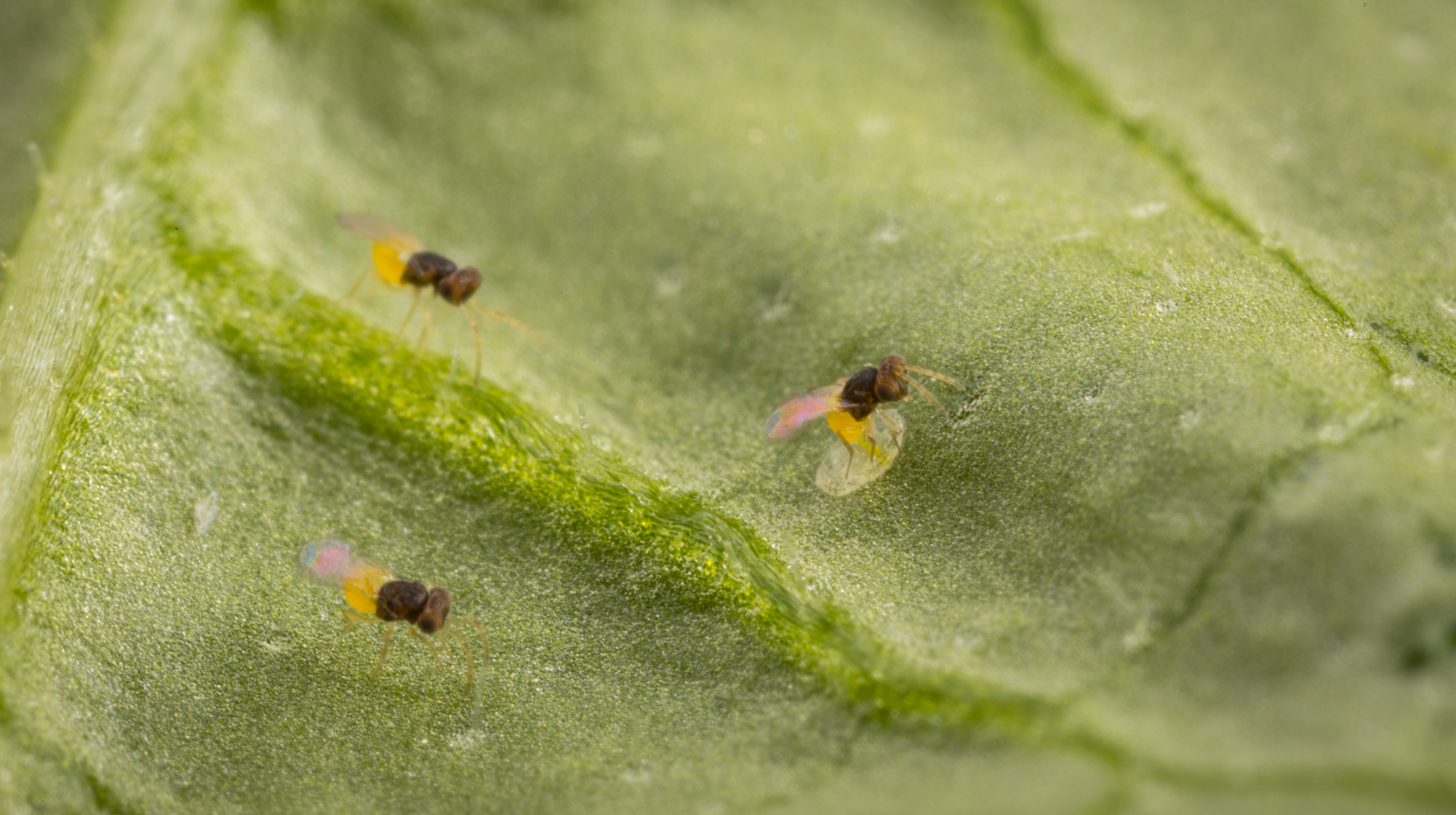 Les femelles adultes des hyménoptères parasitoïdes pondent dans les larves d’aleurodes (troisième et quatrième stade). Le parasitisme intervient ensuite.