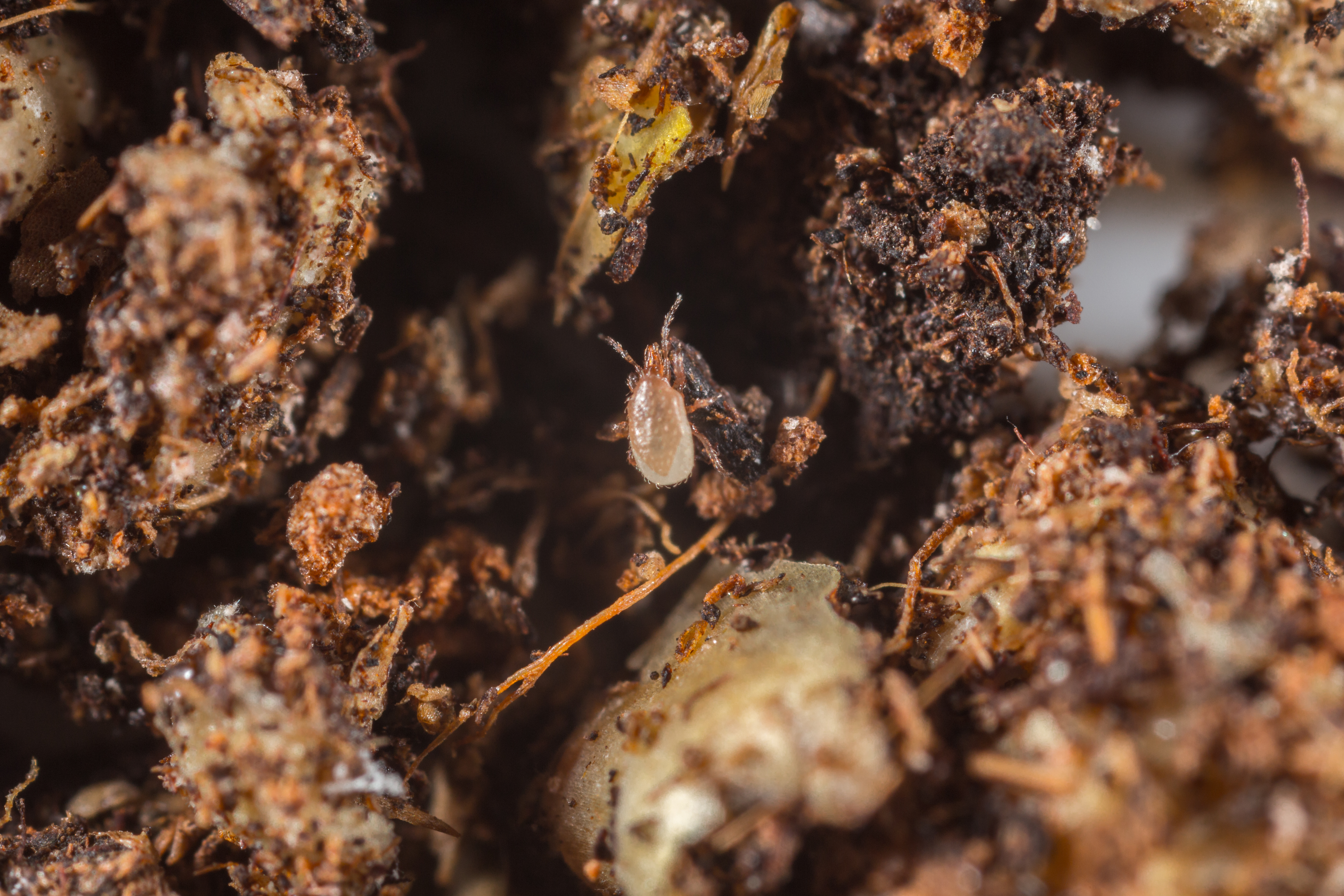 Les acariens prédateurs se nourrissent des larves de mouches sciarides, des pupes de thrips et d’autres insectes terricoles. Les acariens apparaissent dans le sol et en surface, ainsi qu’à la base des tiges. La maîtrise de l’infestation se fait lentement, mais de façon stable.