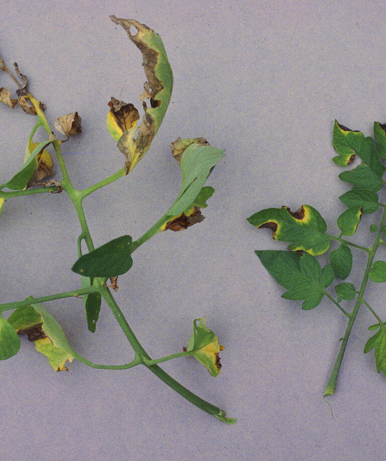 Clavibacter est responsable de taches sur les tiges, les feuilles et les fruits. Les feuilles et les pousses flétrissent. Des lésions blanches semblables à des cloques apparaissent sur les feuilles inférieures, puis deviennent brunes et fusionnent parfois en s’élargissant. Les feuilles flétrissent et se courbent vers le haut, en commençant souvent par un côté de la plante. Elles brunissent mais ne tombent pas. Sur les tiges et les pousses on observe l’apparition de stries claires qui se déchirent et sur lesquelles se forment des chancres. Des lésions en général blanches imbibées d’eau, brunes au centre, apparaissent sur les feuilles de tomate.