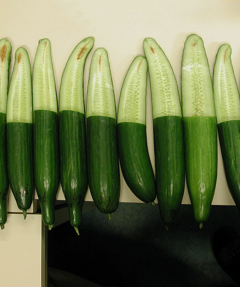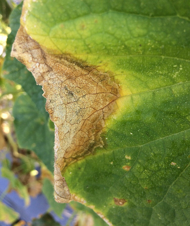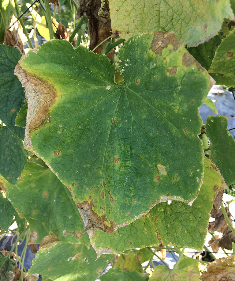 En culture de concombres, Mycosphaerella cucumis est responsable de lésions brunes sur la racine et plus haut sur la tige. Des gouttes gommeuses brun doré apparaissent sur les lésions, d’où le nom de chancre gommeux du concombre. Puis des taches noires apparaissent, formant les corps fructifères des spores. Des lésions rondes et s’élargissant peuvent apparaître sur les feuilles. En culture de concombres, le symptôme le plus important est la pourriture interne du fruit, uniquement reconnaissable par le rétrécissement sensible de la tige des fruits matures. Les symptômes sur les tiges, les feuilles et à l’intérieur des fruits peuvent être tous présents ou se limiter à un seul symptôme.