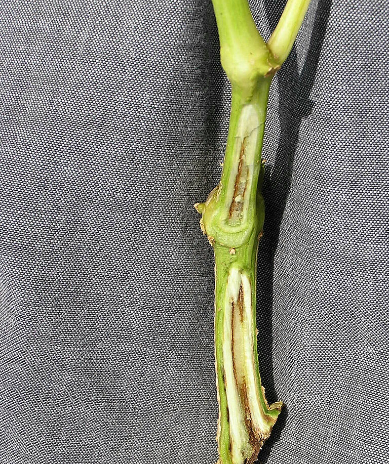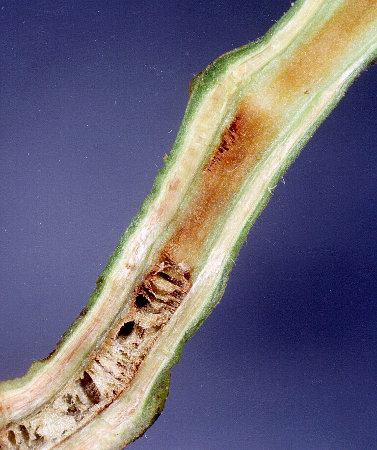 En cultures de tomates, les plus jeunes feuilles sont touchées en premier. Elles montrent des signes de flétrissement durant la journée qui peuvent disparaître au tout début de l’infection. Sous des conditions favorables à la bactérie, la plante entière flétrit dès l’apparition des premiers symptômes. Quand les conditions sont moins favorables au développement de la maladie, la plante peut montrer des signes de retard de croissance et produire de nombreuses racines adventives sur la tige. Le tissu vasculaire est de couleur brune et lorsqu'on coupe la tige, on peut voir une pellicule bactérienne visqueuse en sortir. C’est ce qui permet de distinguer cette maladie des formes de flétrissement causé par Verticillium ou Fusarium (fusariose).