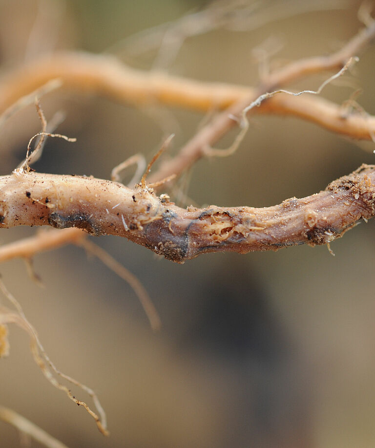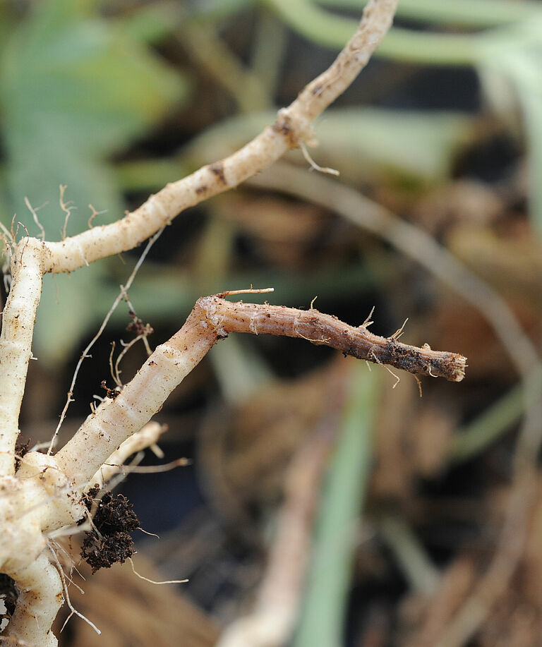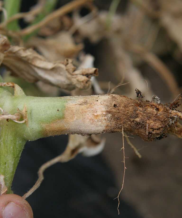 En général, la maladie se limite à quelques racines mais dans les cas les plus graves toutes les racines peuvent être infectées. Au stade final de la maladie, seul subsiste le tissu vasculaire car le cortex (la couche externe) a pourri. En début de culture, l'infection entraîne un retard de croissance, des feuilles plus petites d’un vert intense. Elle peut tuer les jeunes plants dans les cas les plus graves. Si l'infection est moins grave, le flétrissement des plantes se produit à un stade ultérieur, mais peut aussi survenir plus tôt dans la saison si l’arrosage n’a pas été suffisant, par exemple durant les périodes de forte évaporation. Dans les plantes qui flétrissent, la partie aérienne prend un aspect imbibé d’eau, devenant brun clair et s’affaissant avant de prendre une teinte noire et exsudant des spores de couleur ambre. Au tout début du flétrissement, il est difficile de faire la distinction avec les autres symptômes de flétrissement.