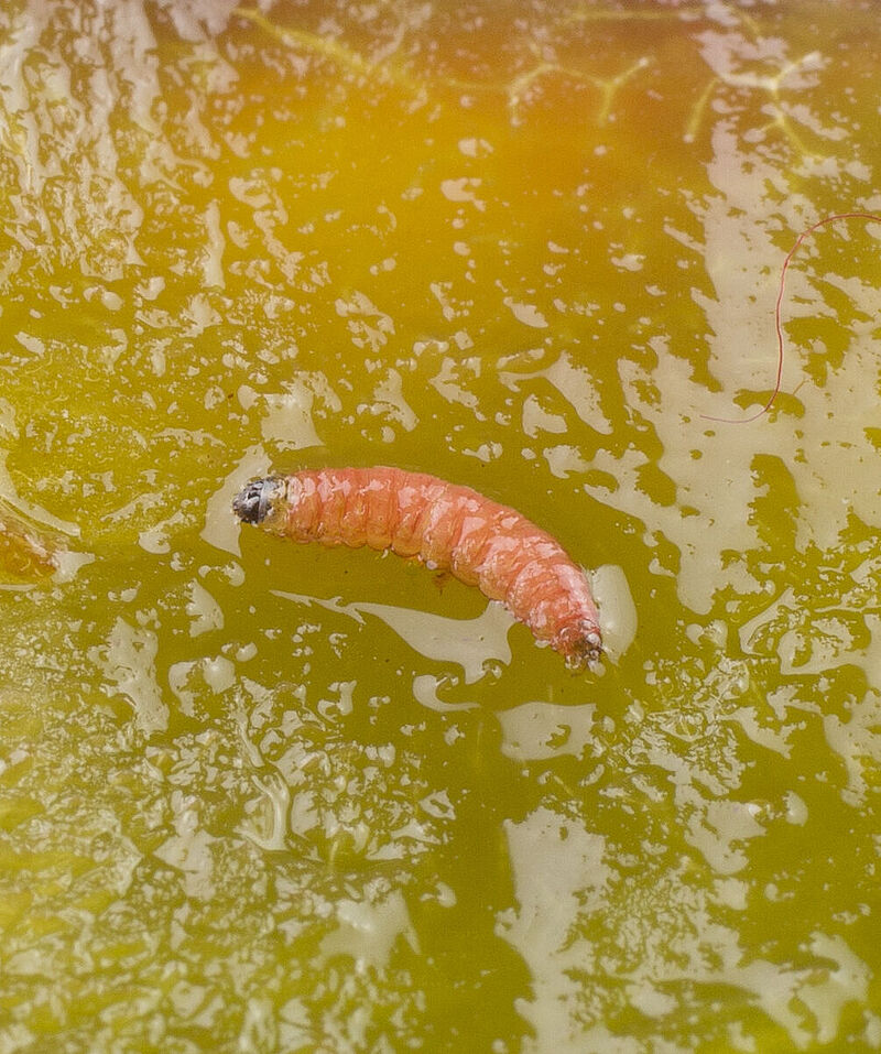 Les œufs sont petits, de couleur blanchâtre translucide juste après la ponte et jaunâtre par la suite. Les larves mesurent jusqu’à 12 mm de long, elles sont rouge rosâtre brillant avec une tête dont la couleur varie du marron foncé au noir. Les jeunes larves sont blanchâtres et translucides. La nymphe est marron clair et mesure 6 à 7 mm de long.