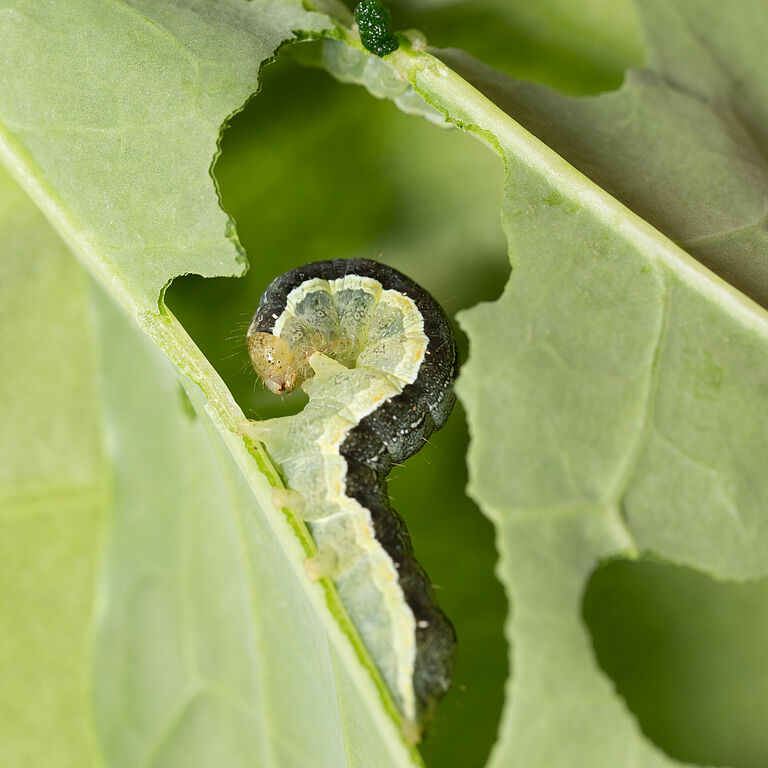 Après l’éclosion, les larves de la noctuelle du chou (Mamestra brassicae) restent groupées, se nourrissant des bords des feuilles sur lesquelles les œufs ont été pondus. À partir du troisième stade larvaire, elles se dispersent sur toute la plante. Ce ravageur présente six stades larvaires : les larves de premier stade ont les téguments transparents et sont jaunes à gris-vert avec la capsule céphalique d’un marron-noir caractéristique. Après la troisième mue, la chenille est verte avec la face dorsale foncée et des rayures jaunes et épaisses sur les côtés. À maturité, la chenille peut être verte, brune ou noire. Les chenilles les plus jeunes se reconnaissent à la capsule céphalique remarquablement grande. Les stades plus âgés, quant à eux, ont des bandes claires entre les segments du corps, ce qui leur donne une apparence annelée caractéristique. Elles se nymphosent dans le sol. Les nymphes mesurent environ 2 cm de long et sont marron brillant tournant au noir juste avant l’émergence de l’adulte.