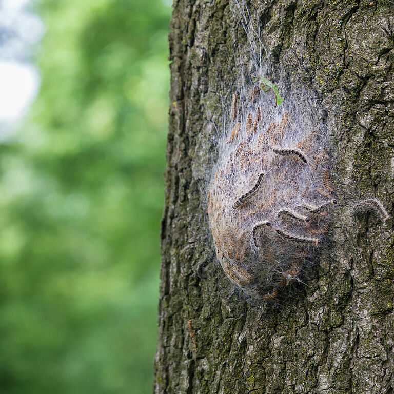 Les larves de premier stade hivernent dans les œufs et éclosent mi-avril ou fin avril. Elles sont nocturnes et se nourrissent de façon grégaire. Les larves qui viennent d’émerger sont marron. Aux stades larvaires suivants, leur corps devient gris. À partir du troisième stade larvaire, chaque larve commence à produire des milliers de très petits poils barbelés très urticants (d’environ 0,1 mm). Ces poils contiennent une protéine allergène, la thaumétopoéfine, qui peut être activement relâchée dans l’air lorsque les larves sont dérangées. Après la mue, les poils des stades précédents restent dans l’exuvie, mais peuvent s’envoler et sont toujours allergènes. Par temps sec, ces poils urticants peuvent rester allergènes pendant des mois. À partir du 5e stade, les larves commencent à construire des nids de soie à la base des branches inférieures, sur le tronc ou à la base des troncs, qui peuvent contenir des milliers d'individus. Les larves restent généralement dans leurs nids pendant le jour et le quittent la nuit en une procession caractéristique pour se nourrir dans la canopée des arbres. Si les feuilles d'un arbre se raréfient, les larves quittent l’arbre en groupe pour coloniser un autre arbre à proximité. Au moment de la nymphose (fin juin, début juillet), les larves filent des cocons dans les nids.