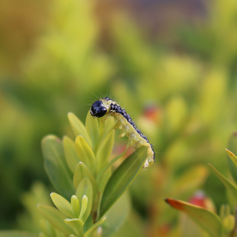 La femelle de la pyrale du buis (Cydalima perspectalis) dépose des groupes de 5 à 20 œufs en une masse gélatineuse translucide sur les feuilles de buis. Les larves vert clair ont une tête noire, des stries noires, des poils et des points blancs. En fonction des conditions environnementales comme la photopériode, la température et la source de nourriture, les larves passent par cinq à sept stades.
