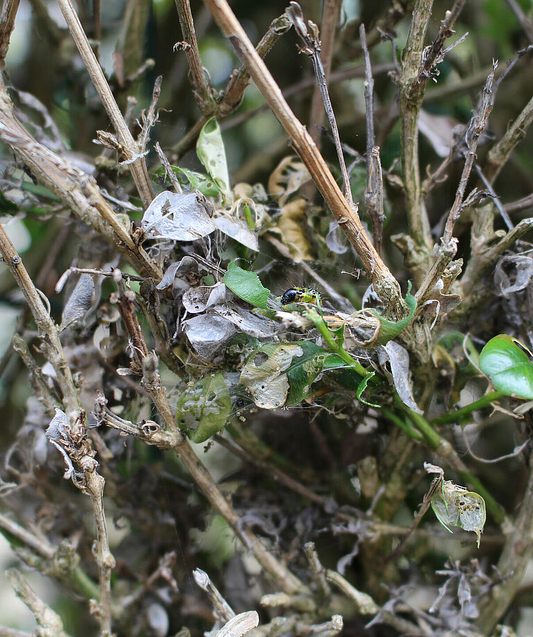 Les nymphes sont cachées entre les feuilles et sont donc difficiles à détecter. Elles sont vertes, avec des lignes longitudinales marron au début de la nymphose et qui s’éclaircissent par la suite, une marque foncée se dessinant à la fin de la nymphose.