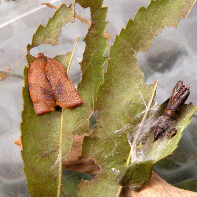 Les larves de la tordeuse méditerranéenne de l'œillet (Cacoecimorpha pronubana) se nourrissent de la partie supérieure de la feuille en la perforant. Au troisième stade larvaire, elles s’attaquent à la feuille complète et l’entourent d’une épaisse masse soyeuse. Elles se cachent dans les feuilles, les bourgeons et les fleurs enroulés de soie.