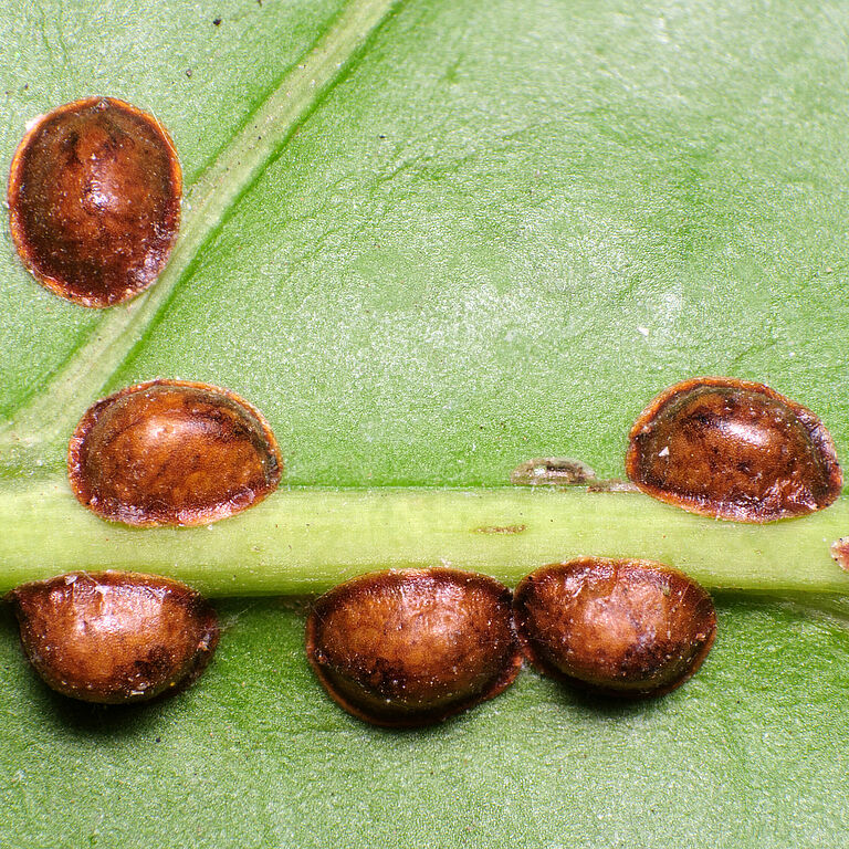 La présence des cochenilles est habituellement assez facile à détecter grâce aux dômes marron brillants sur la partie inférieure de la feuille à proximité de la nervure médiane. Elles produisent une grande quantité de miellat créant des dépôts gluants sur les surfaces environnantes. Le miellat peut attirer les fourmis aux alentours et la fumagine se développe sur les dépôts sucrés. Les feuilles sévèrement touchées peuvent tomber prématurément.