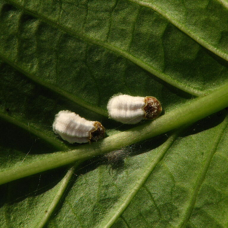 En plein champ, les cochenilles du genre Pulvinaria sont le plus facilement détectables au début de l’été lorsque les femelles produisent leurs ovisacs bien visibles.