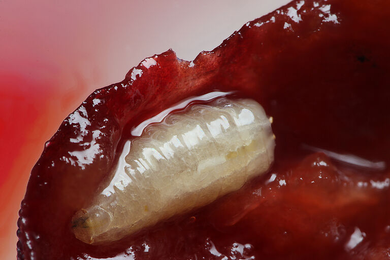 Les adultes apparaissent généralement de fin mai à début juin et sont particulièrement actifs par temps sec et chaud. Les œufs sont pondus individuellement sous la peau d’un fruit en maturation. Ils éclosent au bout de 1 à 2 semaines et les larves se nourrissent de la chair du fruit en développement pendant environ quatre semaines. Autour du moment de la récolte, les larves arrivées à maturité quittent le fruit pour se nymphoser dans le sol. Il n’y a qu'une génération par an. Les mouches hivernent au stade de nymphes.