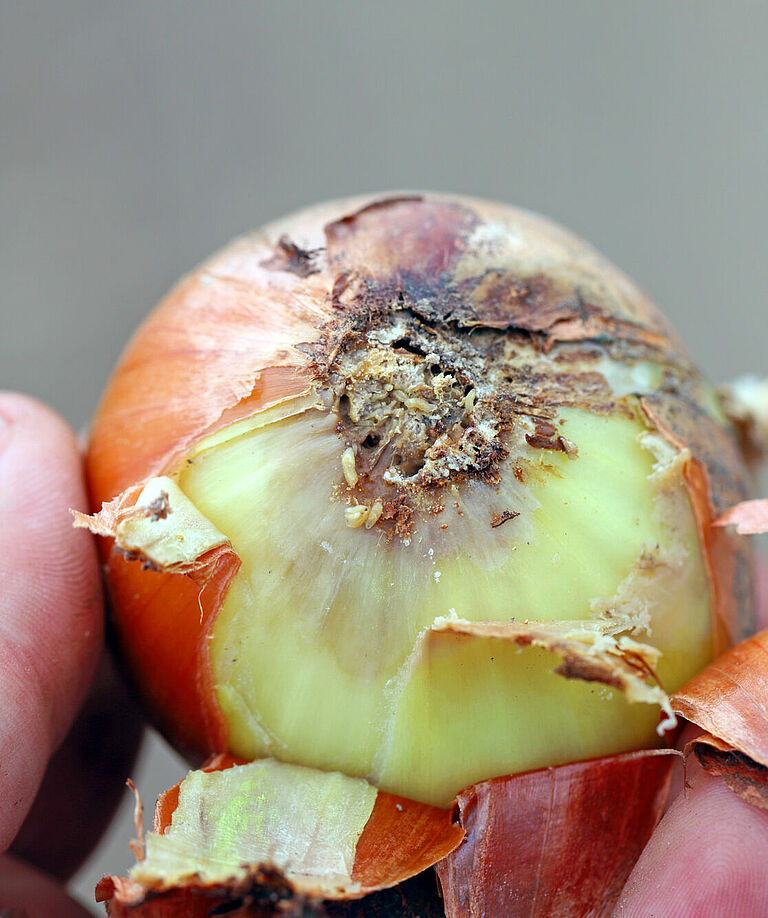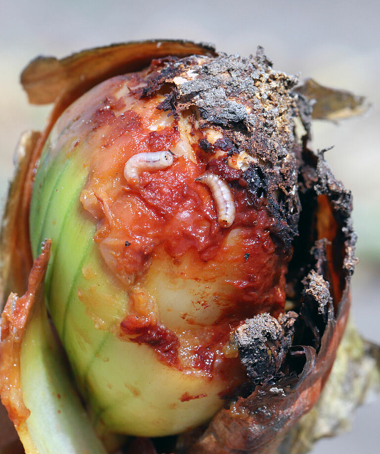 Les dégâts importants causés par la mouche de l'oignon peuvent entraîner un retard de croissance, une réduction du rendement, voire la mort de la plante. Les racines et les feuilles sont abîmées lorsque les larves de la mouche de l'oignon creusent des galeries dans les bulbes d'oignon. Ces dégâts peuvent réduire la qualité des bulbes d'oignon et rendre la plante plus vulnérable à d'autres maladies et ravageurs. Des bulbes gravement abîmés peuvent se ramollir ou se décomposer, ce qui les rend impropres à la consommation.