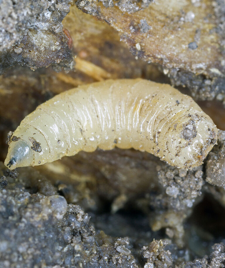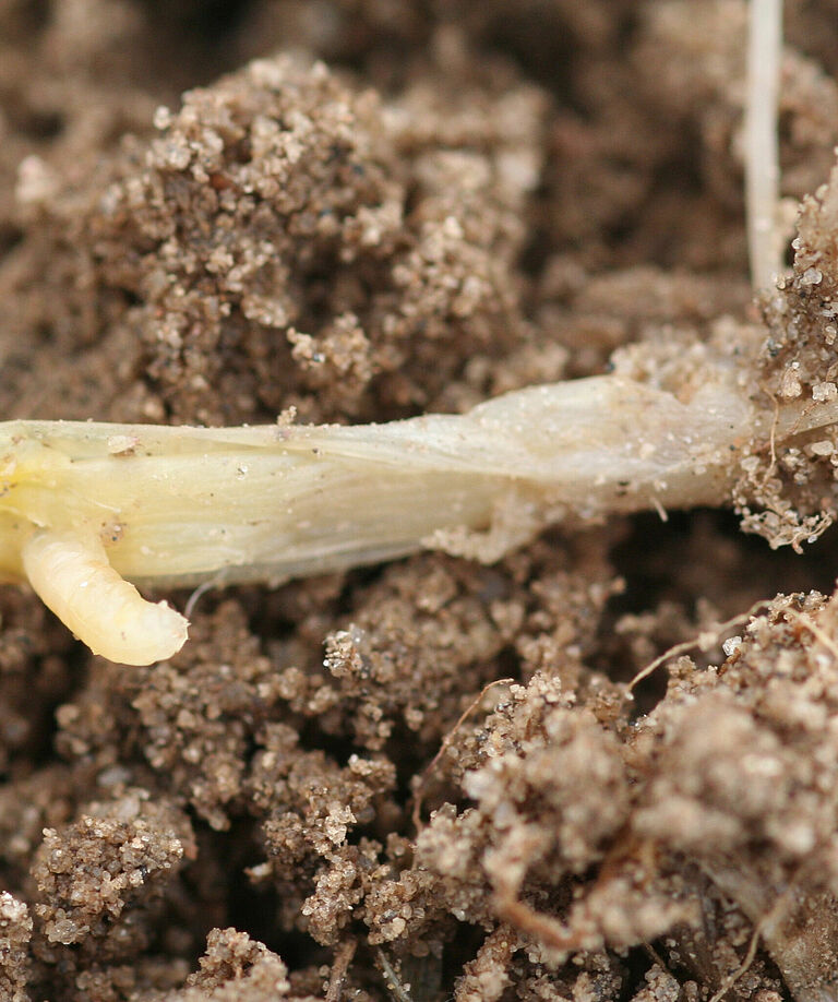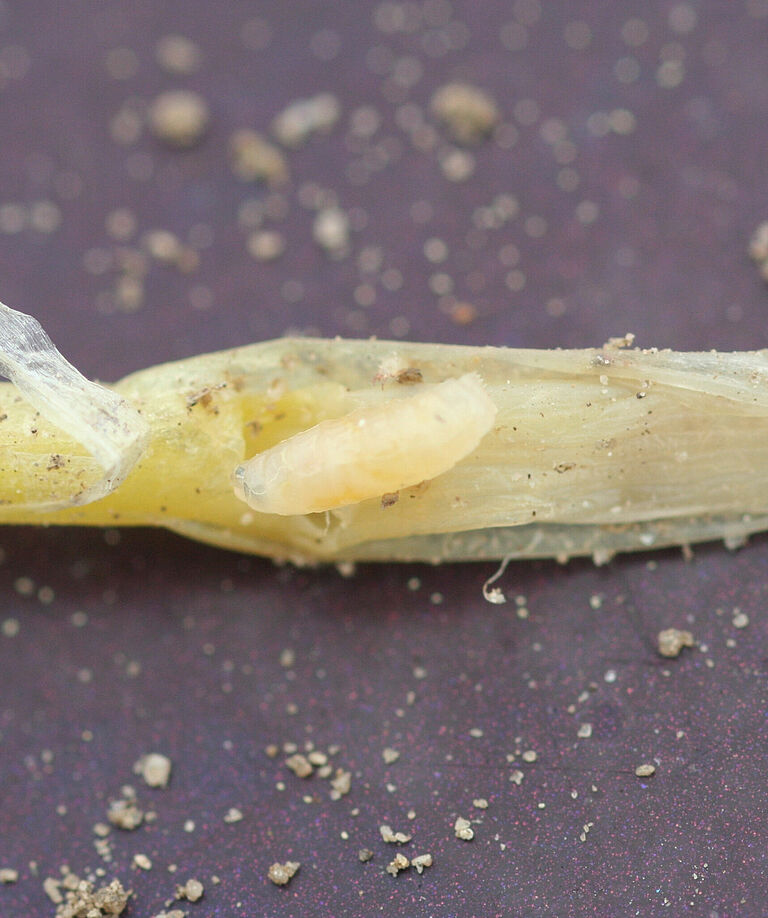 - Présence de larves : petits asticots blancs près de la base des plants de haricots touchés. Ces larves sont un indicateur clair de l'infestation par la mouche des semis.
