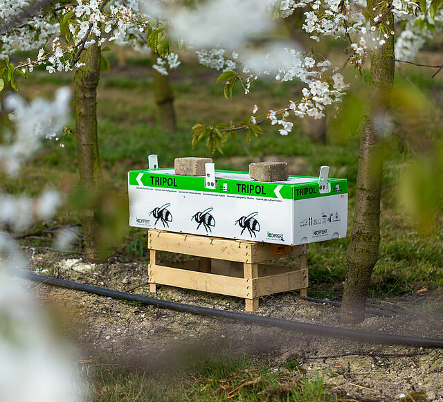'Les pesticides sont mauvais pour les insectes utiles et tout ce que l'on peut faire pour les rendre plus durables est une bonne chose', ajoute Alfred. Les ruches de Moment D'introduction ont été introduites dans les vergers de pommiers et de poiriers il y a six ans, lorsque Alfred, producteur de fruits depuis 35 ans, a remarqué que les fleurs n'étaient pas pollinisées de manière optimale par les abeilles mellifères présentes à l'époque. Les bourdons sont plus actifs que les abeilles domestiques à des températures plus basses, et nous avons constaté qu'une combinaison d'abeilles domestiques et de bourdons apportait une grande amélioration". Alfred utilise deux ruches Tripol par hectare, en commençant par le verger de poires, puis en les déplaçant vers le verger de pommes au début du printemps.