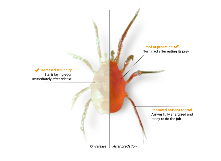Le Phytoseiulus persimilis devient rouge après avoir mangé suffisament de proies. Une fois que l'acarien prédateur a consommé plusieurs tétranyques, la couleur change progressivement en une couleur rouge-orangé caractéristique. Cela prend 1 à 2 jours. Après l'introduction du Spidex Vital « blanc », c'est donc une preuve évidente de prédation lorsque le Spidex Vital rouge est observé.